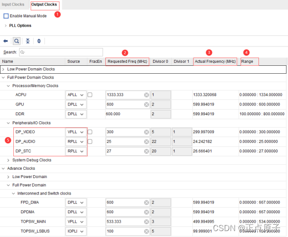 对于输出时钟的配置这里给大家解释一下,首先看上图中标序号4(Range)的那一列,这一列代表所配器件支持的时钟范围,只要在这个范围内都是有效的。而标序号2的这一列代表我们想给这个器件配置什么频率的时钟,序号3代表的是实际产生的时钟频率。因此我们只需要遵行一个原则只要时钟范围在Range内,尽可能的通过改变Source选项使得Requested Freq与Actual Frequency的值相等或者非常接近就可以了。序号5代表我们配置DP相关的时钟。