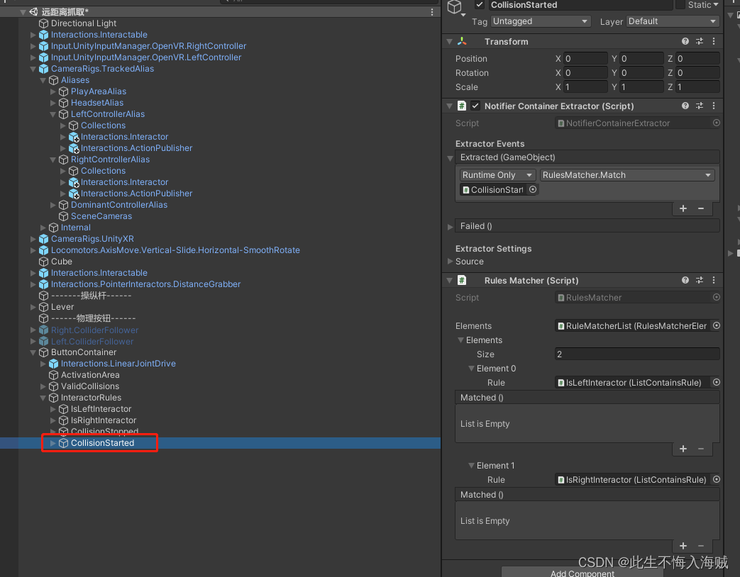 在InteractorRules下面创建一个新的空物体,对其进行重命名(CollisionStopped),然后我们在它身上添加组件Notifier Container Extractor和Rules Matcher: