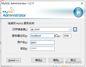 1、下载并安装软件mysql-gui-tools-5.0-r17-win32.exe 2、将汉化包zh_CN文件夹拷贝到软件安装目录 3、菜单中打开MySql Adminstrator,见下图,初次打开无服务实例。 点击已存储连接右侧按钮①,打开下图对话框。点击“新连接”按钮ÿ…...
