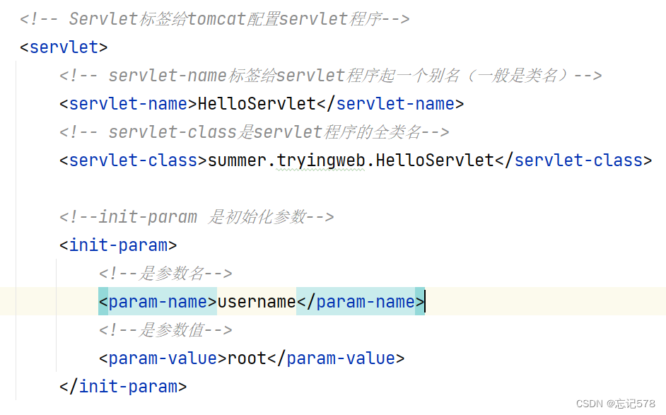 <?xml version="1.0" encoding="UTF-8"?> <web-app xmlns="http://xmlns.jcp.org/xml/ns/javaee"xmlns:xsi="http://www.w3.org/2001/XMLSchema-instance"xsi:schemaLocation="http://xmlns.jcp.org/xml/ns/javaee http://xmlns.jcp.org/xml/ns/javaee/web-app_4_0.xsd"version="4.0"><!-- Servlet标签给tomcat配置servlet程序--><servlet><!-- servlet-name标签给servlet程序起一个别名(一般是类名)--><servlet-name>HelloServlet</servlet-name><!-- servlet-class是servlet程序的全类名--><servlet-class>summer.tryingweb.HelloServlet</servlet-class></servlet><!--servlet-mapping标签给servlet程序配置访问地址--><servlet-mapping><!-- servlet-name标签的作用是告诉服务器,我当前配置的地址给哪个servlet程序使用--><servlet-name>HelloServlet</servlet-name><!-- url-pattern标签配置访问地址/ 斜杠在服务器解析的时候,表示地址为: http://ip:port/工程路径/hello -> http://ip:port/hello--><url-pattern>/hello</url-pattern></servlet-mapping> </web-app>