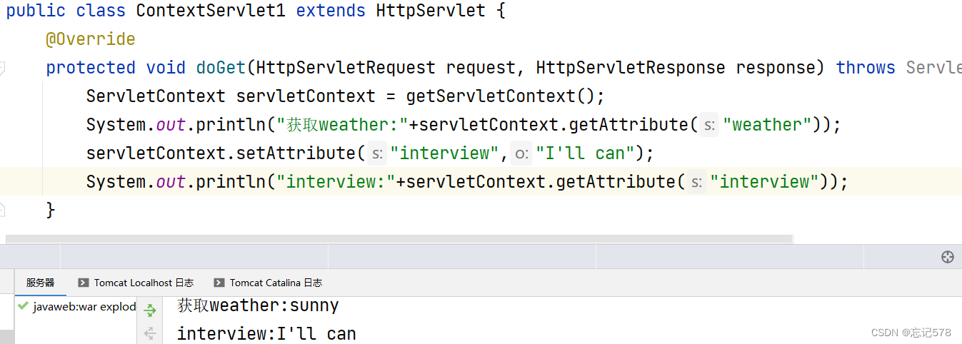 4、像Map 一样存取数据public class ContextServlet extends HttpServlet {@Overrideprotected void doGet(HttpServletRequest request, HttpServletResponse response) throws ServletException, IOException {//1、获取web.xml 中配置的上下文参数context-paramServletContext servletContext = getServletConfig().getServletContext();//ServletContext servletContext1 = getServletContext();也可获取到ServletContext对象String today = servletContext.getInitParameter("today");System.out.println(today);System.out.println(servletContext.getInitParameter("mood"));//2、获取当前的工程路径,格式: /工程路径String contextPath = servletContext.getContextPath();System.out.println(contextPath);//3、获取工程部署后在服务器硬盘上的绝对路径String realPath = servletContext.getRealPath("/");System.out.println(realPath);//4、像Map 一样存取数据servletContext.setAttribute("weather","sunny");}