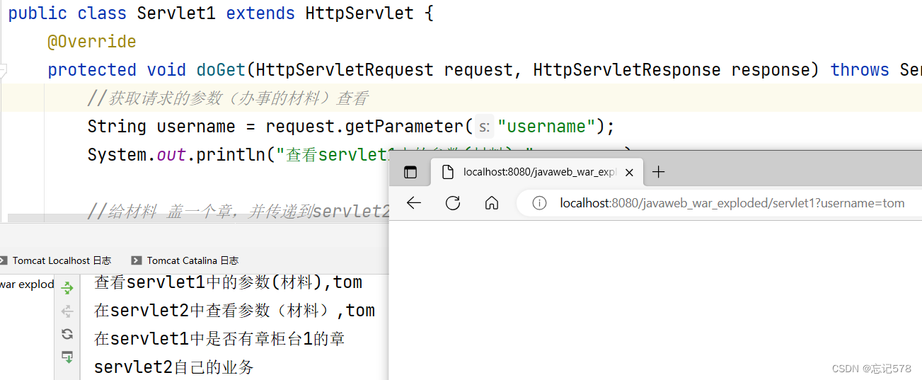 index.html中 <body>这是web下的index.html<br/><a href="a/b/c.html">a/b/c.html</a><br/><a href="http://localhost:8080/tryingweb/forward">请求转发:a/b/c.html</a><br/> </body>创建的Forward类中 public class Forward extends HttpServlet {@Overrideprotected void doGet(HttpServletRequest req, HttpServletResponse resp) throws ServletException, IOException {System.out.println("经过了Forward程序");req.getRequestDispatcher("a/b/c.html").forward(req,resp);} }