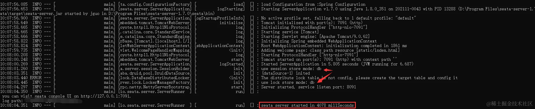 server端基础配置已经完成,运行bin下的seata-server.bat脚本启动服务(linux执行sh seata-server.sh命令)。出现下述打印即为启动成功。(linux到/root/logs/seata目录下查看打印日志)