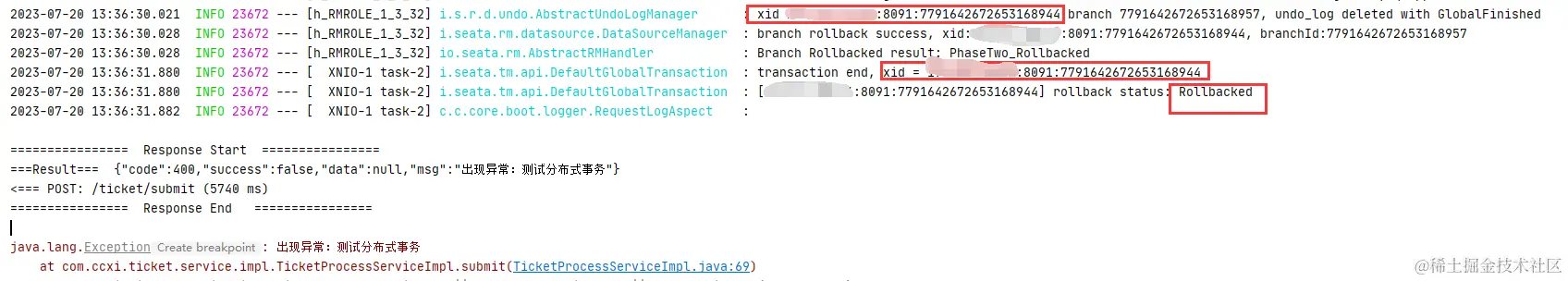 如果成功触发回滚,两个微服务的控制台均会打印相关信息,重点关注xid应该为一致的。
