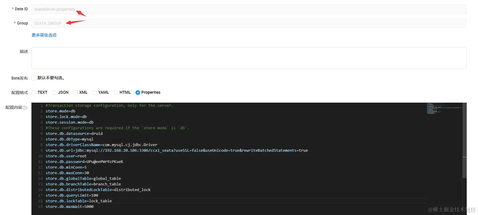 注意到上面配置项中有一项:seata.config.data-id=seataServer.properties,意思为要读nacos上的seataServer.properties配置文件,接下来去Nacos创建该配置文件,注意Group与第2步中的保持一致,这里是SEATA_GROUP。