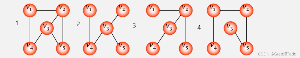 如上图所示,除了第一个不是生成树(因为存在环),其他都是生成树。