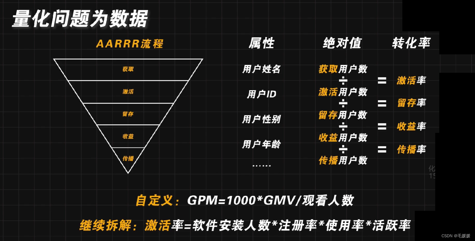 - 最后除了指标彼此之间的计算,还可以对指标继续进行拆解,例如刚才的AARRR中,激活率=软件安装人数注册率使用率*活跃率,这样就能让我们补充一些细分的指标,更加全面的量化问题