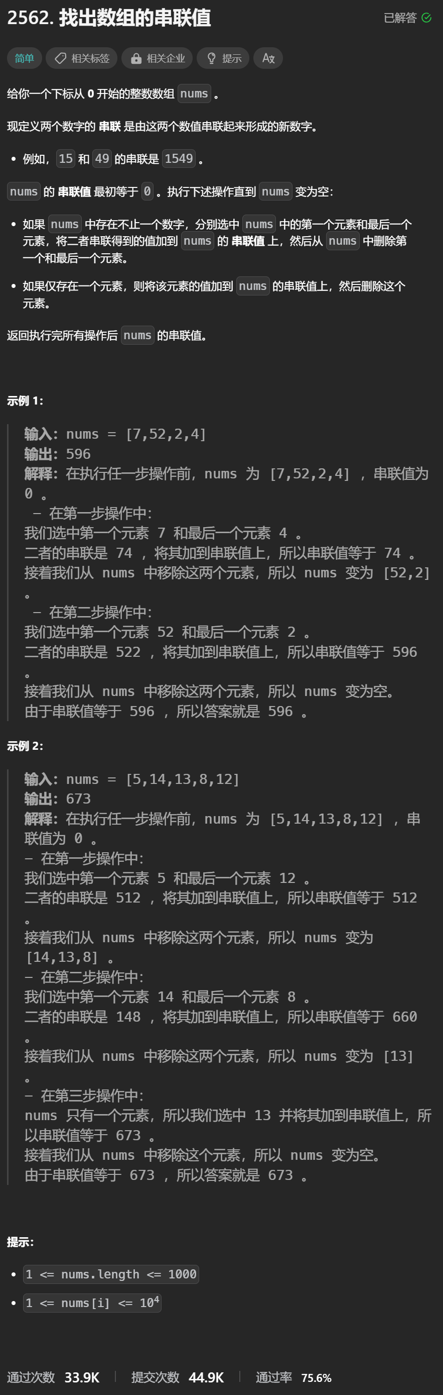 long long findTheArrayConcVal(int* nums, int numsSize){int left = 0;int right = numsSize - 1;long long sum = 0;while(left <= right) {if(left == right) {sum += nums[left];break;}int tmpR = nums[right];while(tmpR) {nums[left] *= 10;tmpR /= 10;}sum += nums[left++] + nums[right--];}return sum;