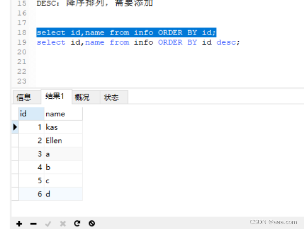 select id,name,score from info where sex='女' order by id desc;select id,name,score from info where sex='女' order by score desc,id desc;