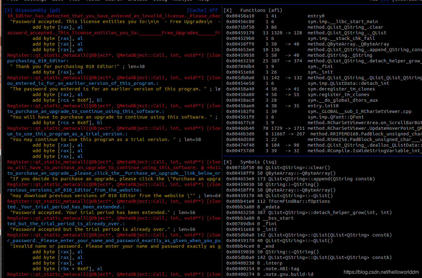 查看字符串 使用rabin2 -z /home/burning/010editor/010editor | tee 22.txt 查看字符串。 6698 0x003ba380 0x007ba380 68 69 .rodata ascii The password you entered is for an earlier version of this program. 6699 0x003ba3c8 0x007ba3c8 70 71 .rodata ascii You will…...