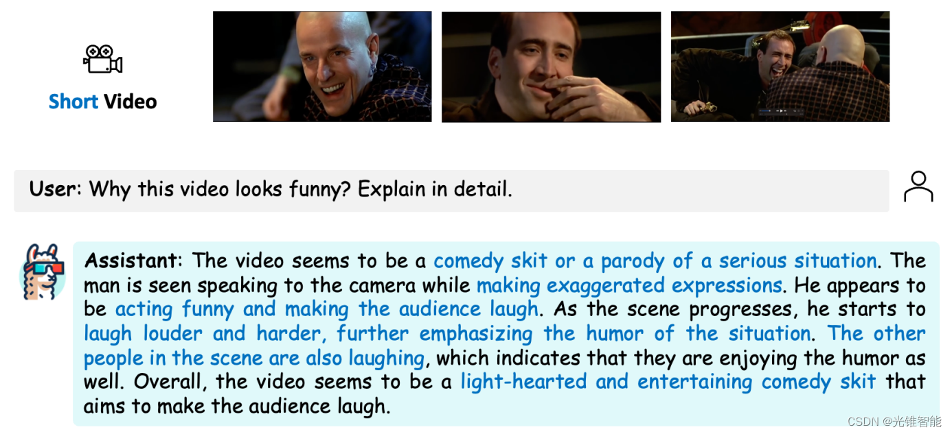 LLaMA-VID能够分析短视频中知名表情包的笑点,因为视频中人物夸张的表情以及对周围人物的情绪感染不断加深并强化。