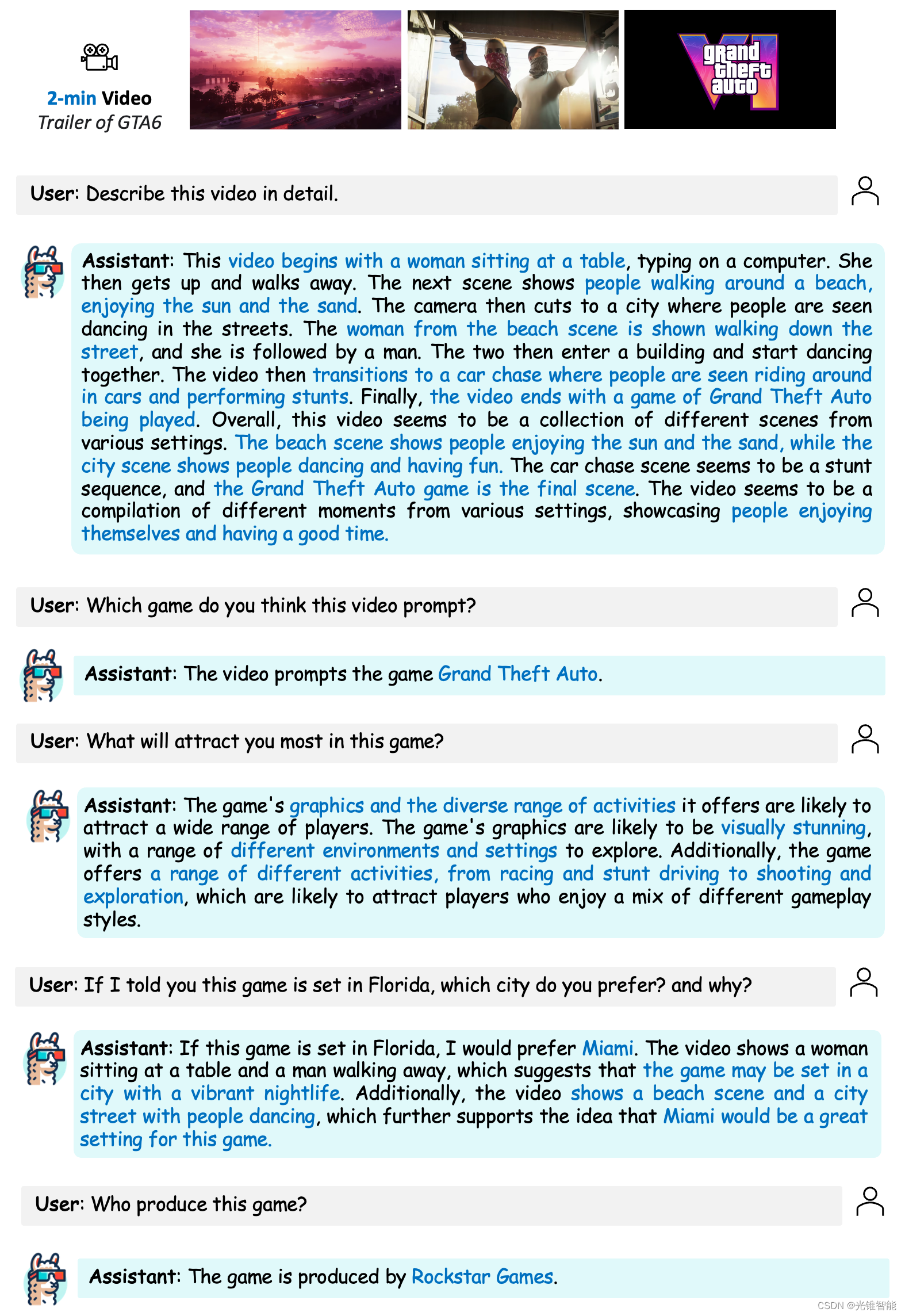 LLaMA-VID能够准确理解预告片里出现的场景,并能分析预告片中游戏吸引人的地方在于广泛的活动场景和惊艳的视觉效果。