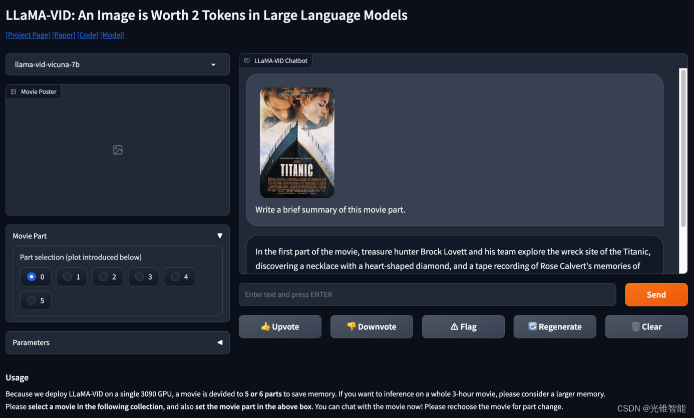值得一提的是,LLaMA-VID的视频理解和推理能力已经出了Demo,可以在线跟电影对话的那种。