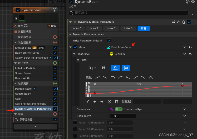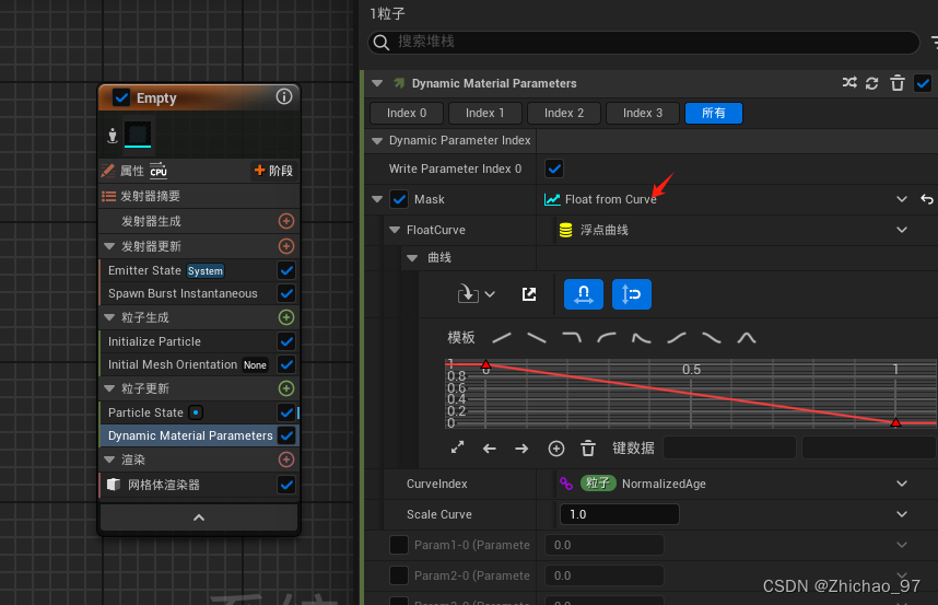 回到Niagara系统中,添加一个“Dynamic Material Parameters”模块,设置材质参数“Mask”为一个从0到1的曲线