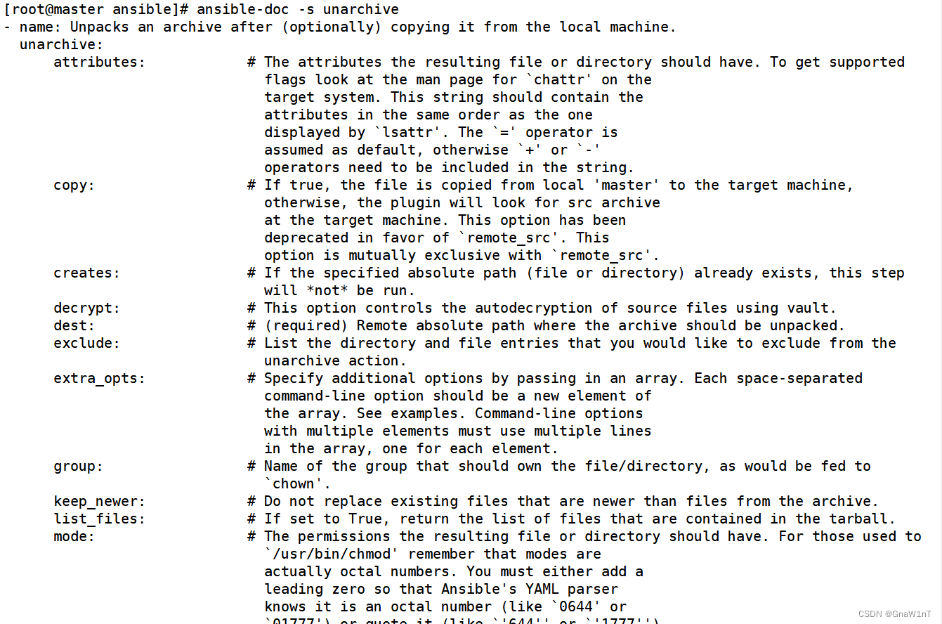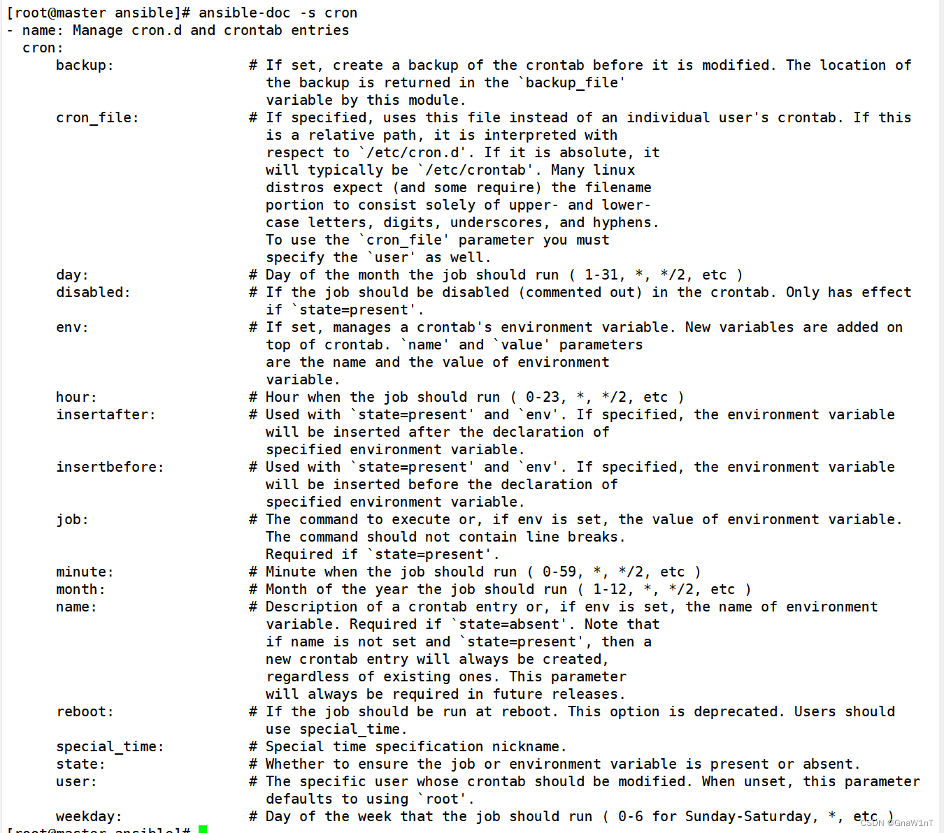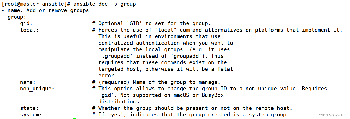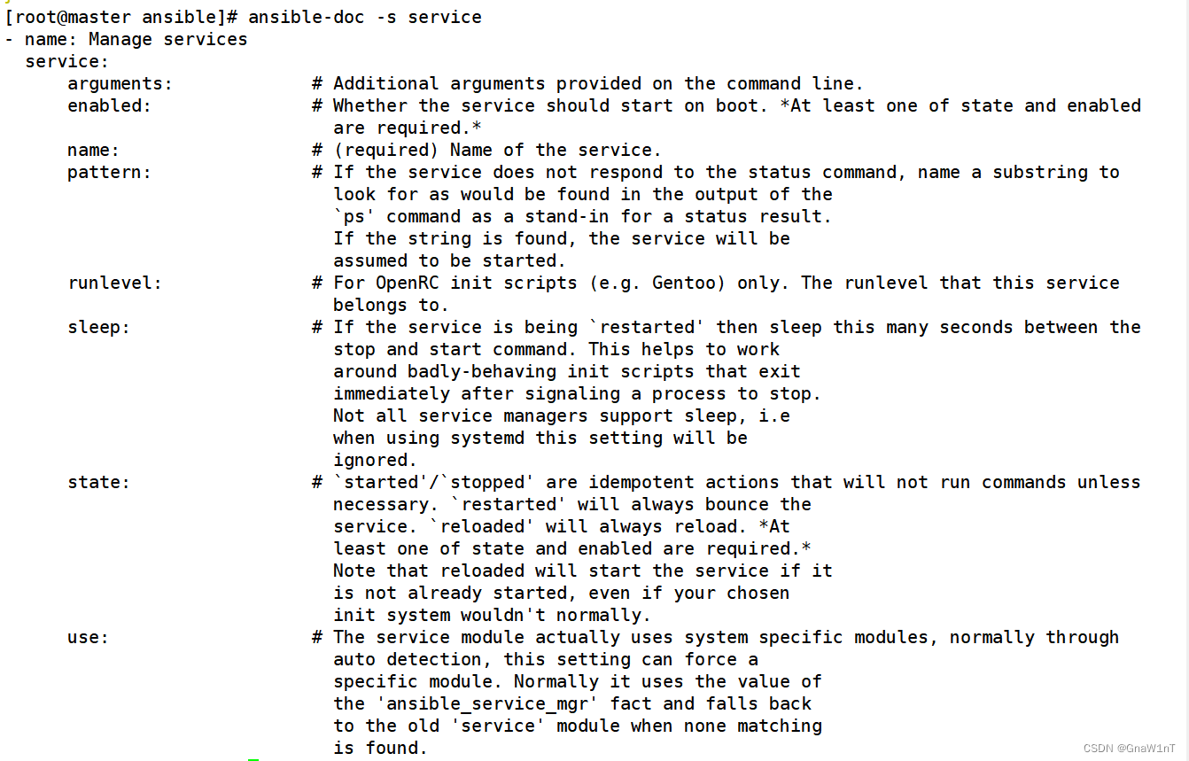 ansible-doc -s command #-s 列出指定模块的描述信息和操作动作