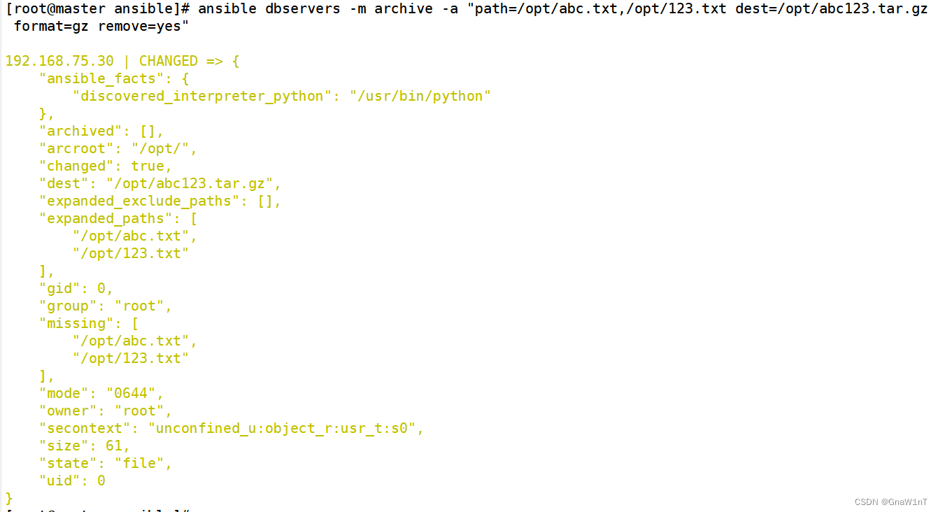 ansible dbservers -m archive -a "path=/opt/abc.txt,/opt/123.txt dest=/opt/abc123.tar.gz format=gz remove=yes"