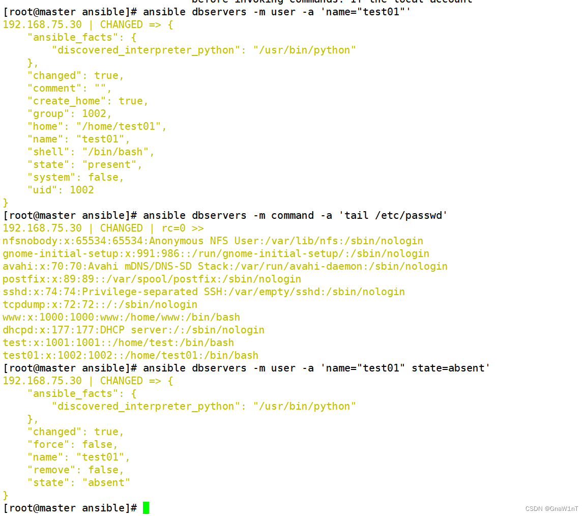 ansible dbservers -m user -a 'name="test01"' #创建用户test01