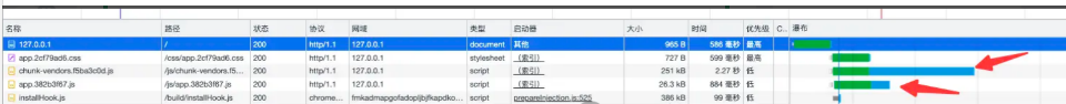 用弱网访问,看下的图,很明显 app.382b3f67.js 要先下载完(因为size小)。