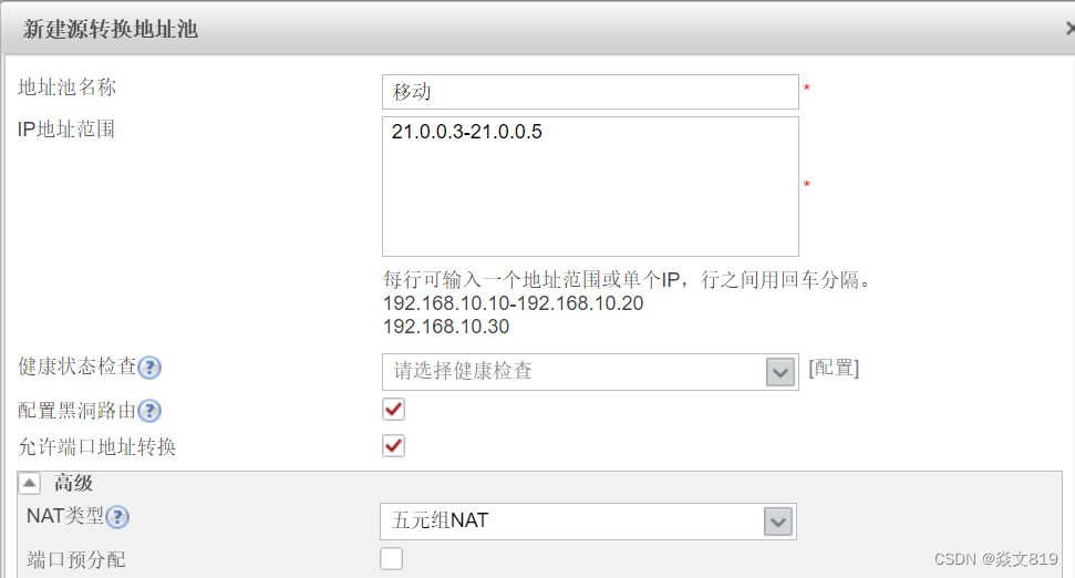 3,办公区设备可以通过电信链路和移动链路上网(多对多的NAT,并且需要保留一个公网IP不能用来转换)