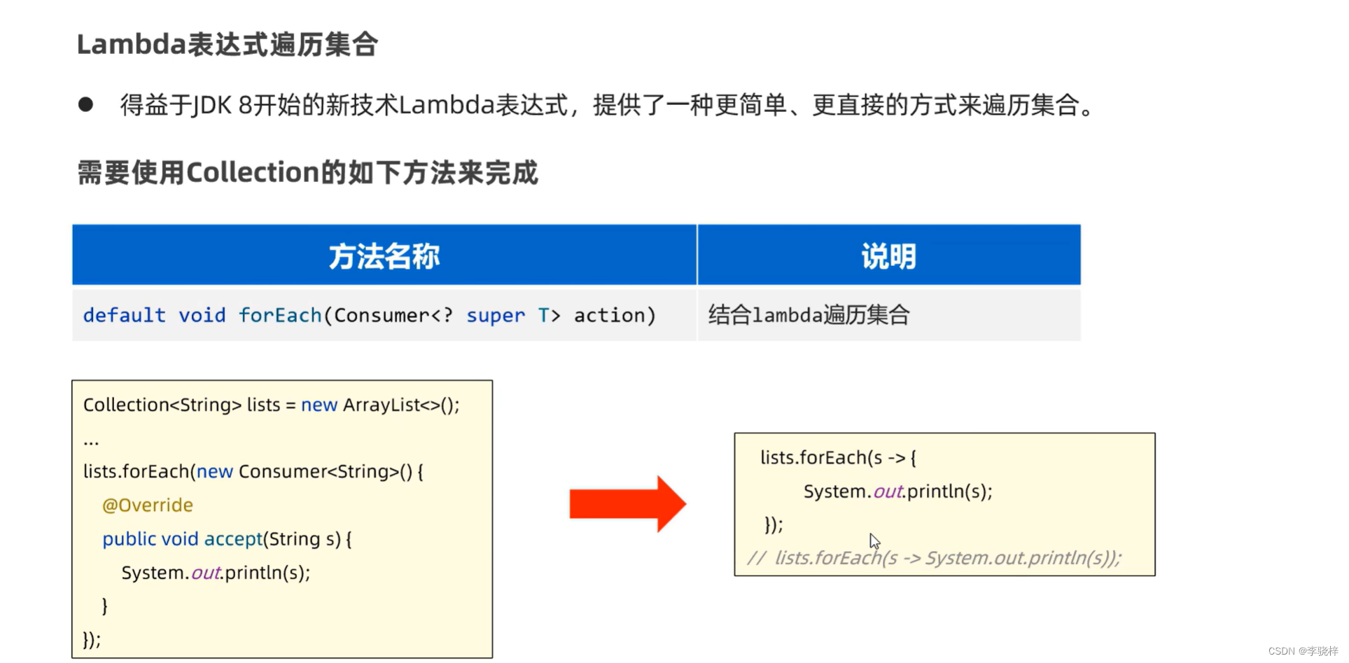 import java.util.function.Consumer;public class CollectionDemo3 {public static void main(String[] args) {Collection<String> c = new ArrayList<>();c.add("赵敏");c.add("小邵");c.add("殷速速");c.add("周芷若");System.out.println(c);//c = [赵敏, 小邵, 殷速速, 周芷若]// s//default void forEach(Consumer<? super T> action): 结合Lambda表达式遍历集合://Consumer是一个接口不能直接创建对象 所以可以直接new一个匿名内部类对象出来c.forEach(new Consumer<String>() {@Overridepublic void accept(String s) {System.out.println(s);}});System.out.println("--------------------------");c.forEach((String s) -> {System.out.println(s);});System.out.println("--------------------------");c.forEach(s -> System.out.println(s));System.out.println("--------------------------");c.forEach(System.out::println);}