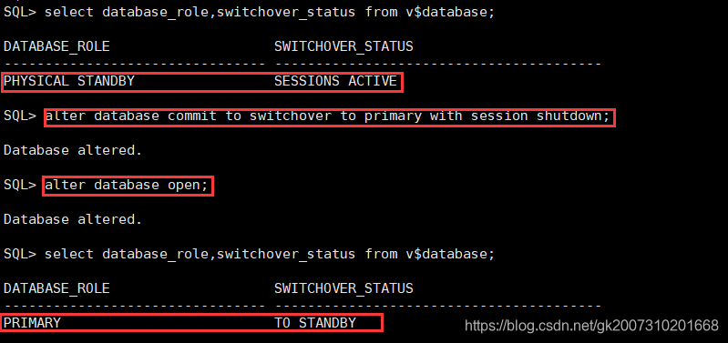--查询数据库角色和保护模式 select database_role,switchover_status from v$database; --切换备库为主库(切换后,主库为mount状态) --TO PRIMARY alter database commit to switchover to primary; --SESSIONS ACTIVE alter database comm…...