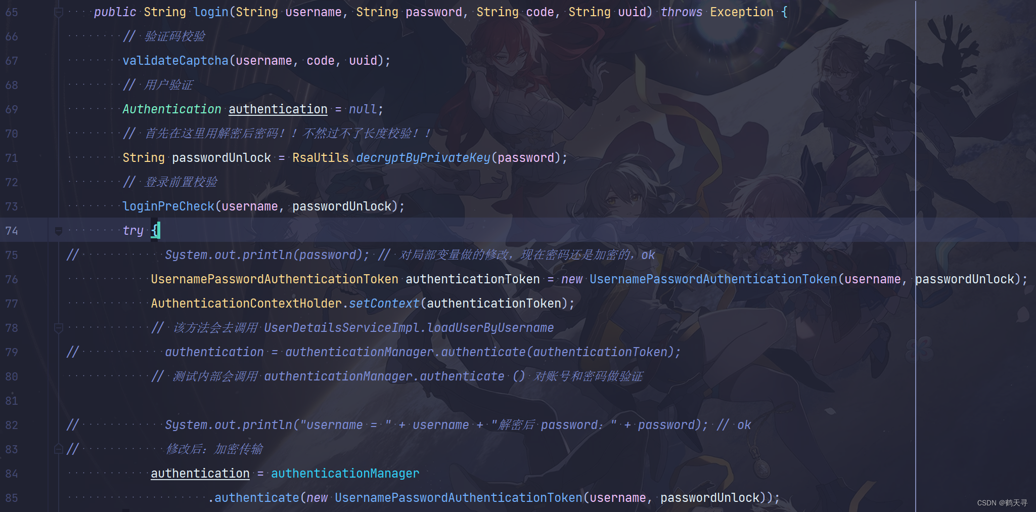 // authentication = authenticationManager.authenticate(authenticationToken);// 测试内部会调用 authenticationManager.authenticate () 对账号和密码做验证// System.out.println("username = " + username + "解密后 password:" + password); // ok