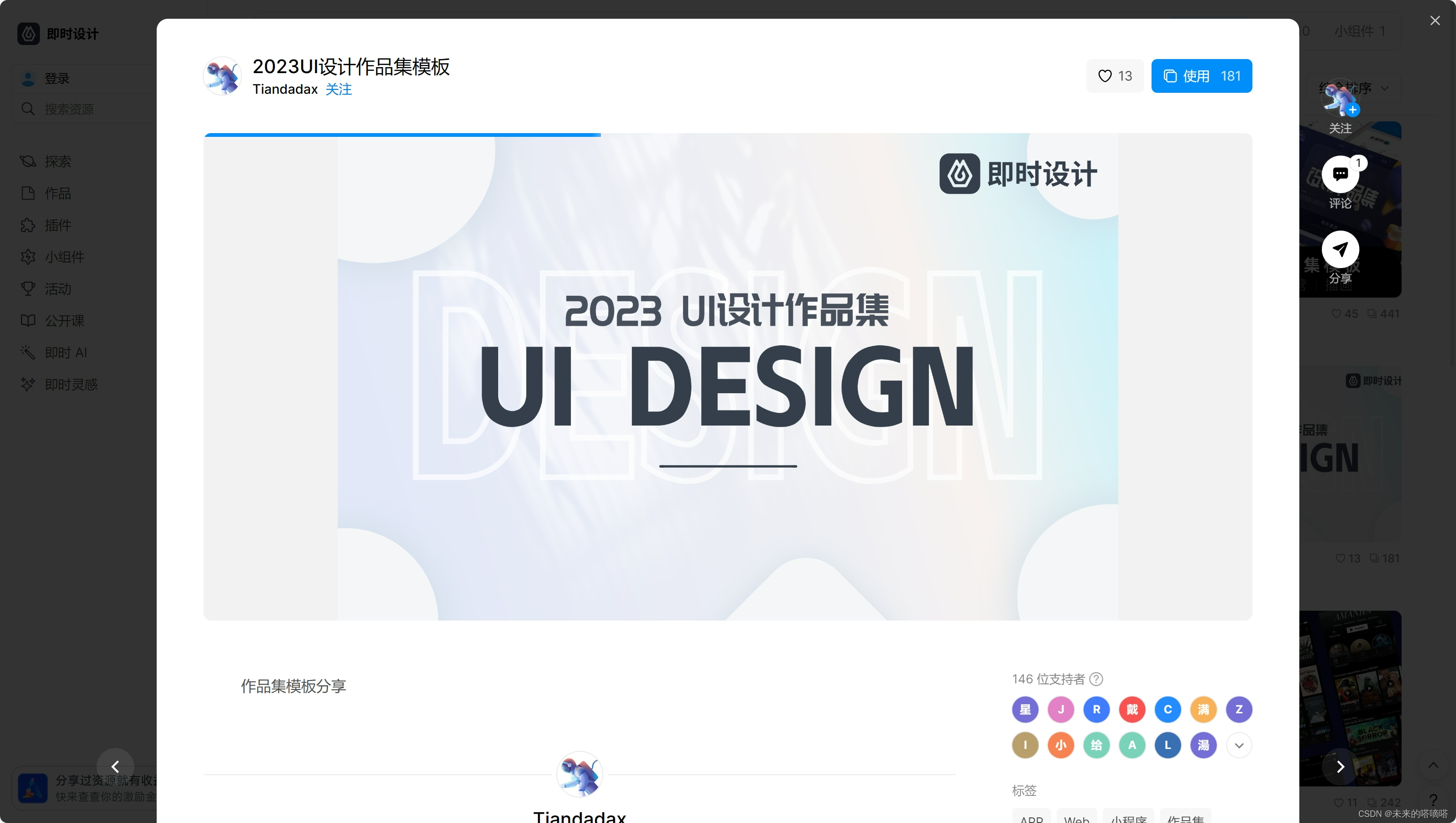 UI 设计师及其团队也可通过在线设计系统,共同建立云组件库。团队成员可实时合作,并能自动生成链接,高效交付。即时设计还自带 ArcoDesign、AntDesign、3000 + 设计资源和设计系统,如 Tdesign,一键重用项目中常用的图标和自制组件!