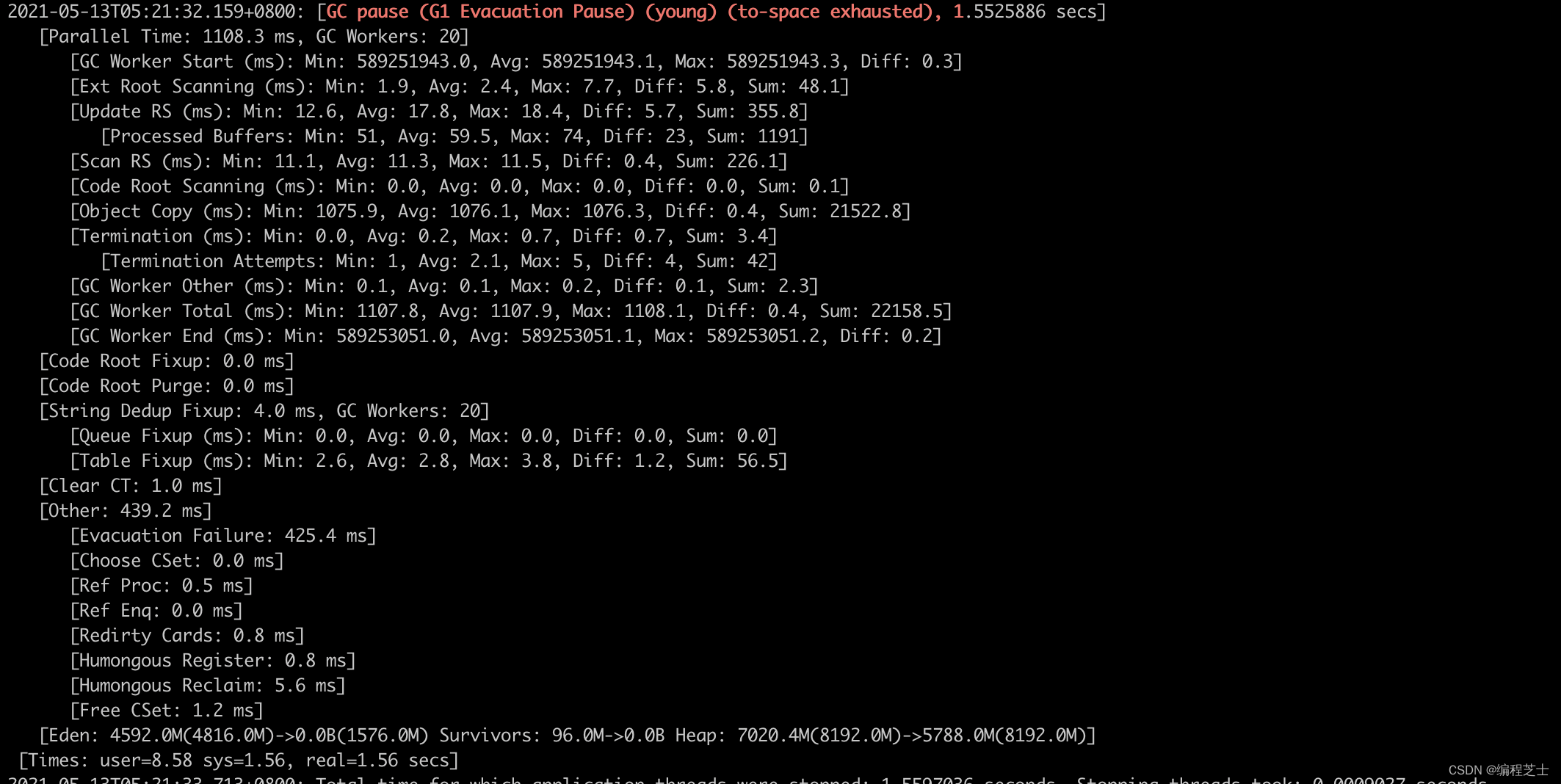 2022-05-17T11:35:04.163+0800: [GC pause (G1 Evacuation Pause) (young) (to-space exhausted), 1.46786732 secs][Parallel Time: 1205.9 ms, GC Workers: 20][GC Worker Start (ms): Min: 5038821026.8, Avg: 5038821026.9, Max: 5038821027.0, Diff: 0.2][Ext Root Scanning (ms): Min: 0.7, Avg: 1.0, Max: 2.6, Diff: 1.8, Sum: 13.6][Update RS (ms): Min: 12.4, Avg: 13.8, Max: 14.7, Diff: 2.3, Sum: 179.6][Processed Buffers: Min: 71, Avg: 87.8, Max: 106, Diff: 35, Sum: 1141][Scan RS (ms): Min: 0.0, Avg: 0.2, Max: 0.3, Diff: 0.3, Sum: 2.8][Code Root Scanning (ms): Min: 0.0, Avg: 0.0, Max: 0.0, Diff: 0.0, Sum: 0.0][Object Copy (ms): Min: 1094.0, Avg: 1094.5, Max: 1094.7, Diff: 0.7, Sum: 22728.8][Termination (ms): Min: 0.0, Avg: 0.1, Max: 0.2, Diff: 0.2, Sum: 1.5][Termination Attempts: Min: 1, Avg: 1.1, Max: 2, Diff: 1, Sum: 14][GC Worker Other (ms): Min: 0.0, Avg: 0.0, Max: 0.1, Diff: 0.1, Sum: 0.3][GC Worker Total (ms): Min: 609.6, Avg: 609.7, Max: 609.9, Diff: 0.2, Sum: 7926.6][GC Worker End (ms): Min: 5038821636.6, Avg: 5038821636.6, Max: 5038821636.6, Diff: 0.1][Code Root Fixup: 0.0 ms][Code Root Purge: 0.0 ms][Clear CT: 0.4 ms][Other: 320.7 ms][Evacuation Failure: 315.7 ms][Choose CSet: 0.0 ms][Ref Proc: 0.5 ms][Ref Enq: 0.0 ms][Redirty Cards: 0.5 ms][Humongous Register: 0.1 ms][Humongous Reclaim: 3.5 ms][Free CSet: 0.6 ms][Eden: 2176.0M(2360.0M)->0.0B(1920.0M) Survivors: 96.0M->0.0B Heap: 3764.9M(4096.0M)->1750.9M(4096.0M)][Times: user=6.67 sys=2.00, real=1.53 secs]
