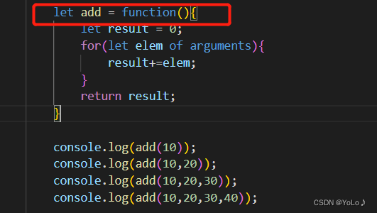 function add(){let result = 0;for(let elem of arguments){result+=elem;}return result;}console.log(add(10));console.log(add(10,20));console.log(add(10,20,30));console.log(add(10,20,30,40));