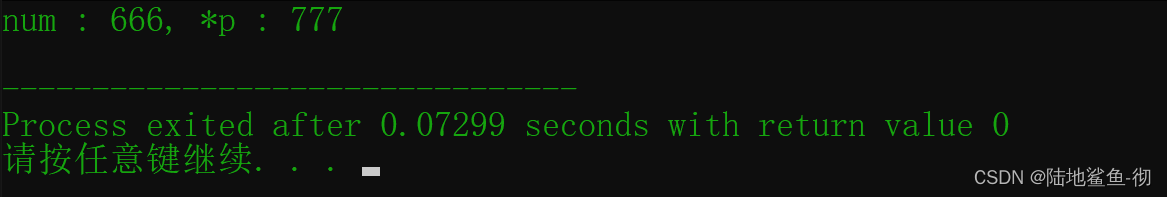 #include <iostream>using namespace std;int main(){const int num = 666;int *p = (int *)#*p = 777;cout << "num : " << num << ", *p : " << *p << endl;cout << "num 's address : " << &num << endl;cout << "(*p)'s address : " << p << endl; return 0;
