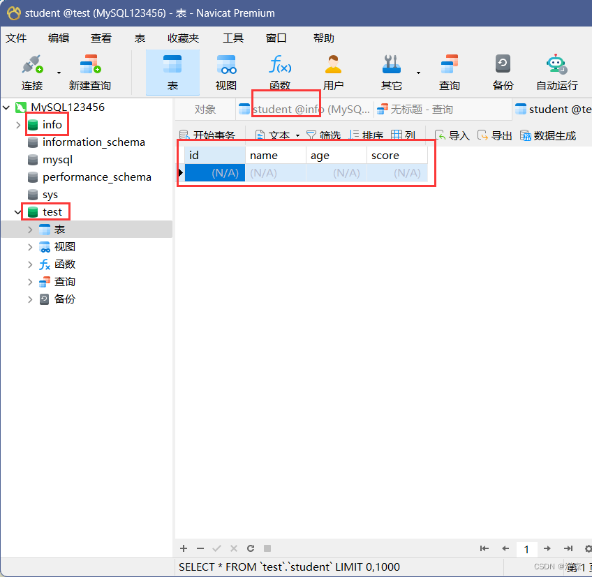 {ui->setupUi(this);//打印Qt支持的数据库驱动qDebug()<<QSqlDatabase::drivers();//添加MYSQl数据库QSqlDatabase db=QSqlDatabase::addDatabase("QMYSQL");//连接数据库db.setHostName("127.0.0.1");//数据库服务器ipdb.setUserName("root");//数据库用户名db.setPassword("123456");//密码db.setDatabaseName("info");//使用哪个数据库//打开数据库if( !db.open() )//数据库打开失败{QMessageBox::warning(this,"错误",db.lastError().text());return;}QSqlQuery query;query.exec("create table student(id int primary key auto_increment,name varchar(255),age int,score int);");//create table student(:这行代码开始创建一个新表,表名为 student。//id int primary key auto_increment,:这行定义了一个名为 id 的列,数据类型为整数(int)。primary key 表示这个列是表的主键,用于唯一地标识表中的每一行。auto_increment 属性表示每当向表中插入新行时,这个列的值会自动增加,从而保证每个 id 的唯一性。//name varchar(255),:这行定义了一个名为 name 的列,数据类型为可变长字符串(varchar),最大长度为255个字符。//age int,:这行定义了一个名为 age 的列,数据类型为整数(int),用于存储学生的年龄。//score int);:这行定义了一个名为 score 的列,数据类型为整数(int),用于存储学生的分数。最后的 ); 表示表定义的结束。}Widget::~Widget()