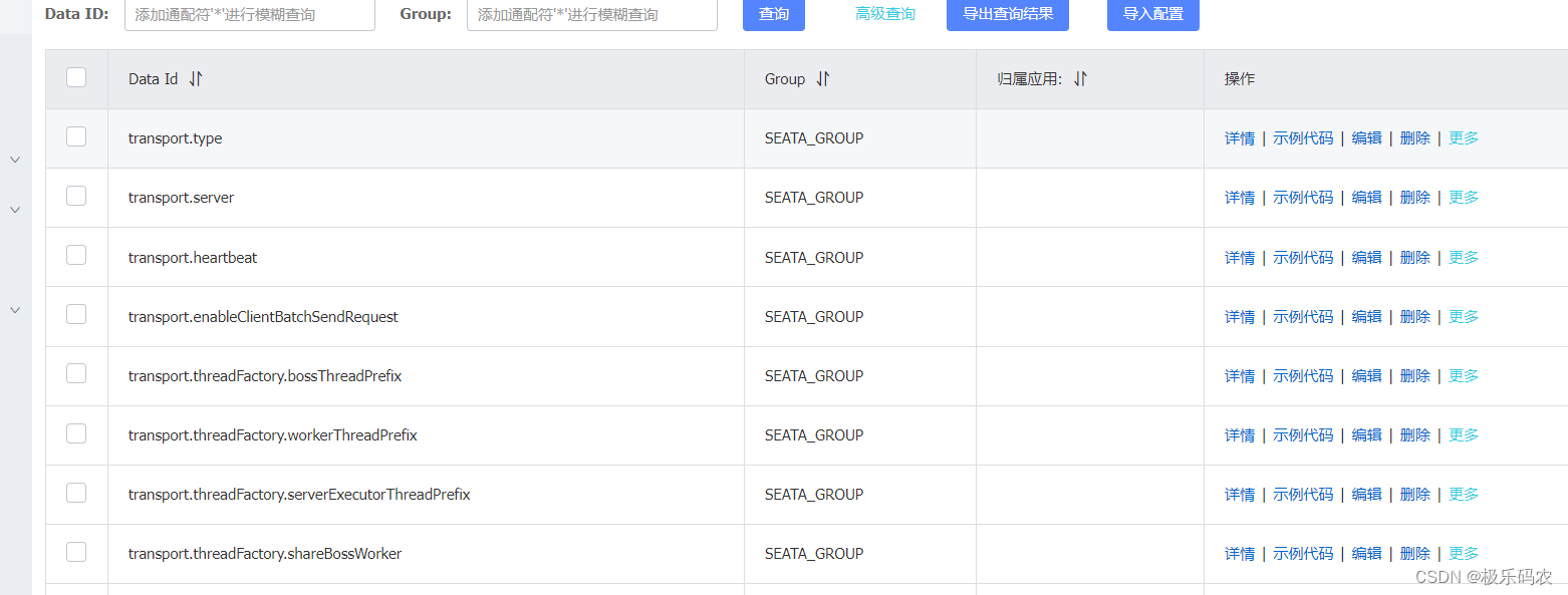 }config {# file、nacos 、apollo、zk、consul、etcd3type = "nacos"nacos {serverAddr = "127.0.0.1:8848"namespace = ""group = "SEATA_GROUP"username = ""password = ""}