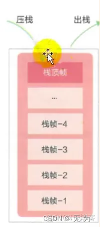 每个方法的运行都对应的入栈出栈的过程 这是一种快速有效的分配存储方式。栈中存储栈帧 每个栈帧就对应一个方法。