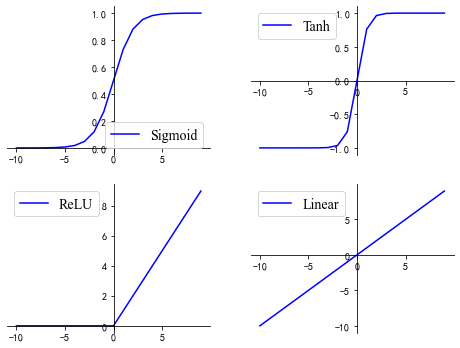 }def plot_tran_fun(): plt.rcParams['font.sans-serif']=['SimHei']plt.rcParams['axes.unicode_minus'] = Falsefig = plt.figure(figsize=(8,6))ax1 = plt.subplot(2,2,1)x = np.arange(-10, 10)y = sigmoid(x)ax.spines['top'].set_color('none')ax.spines['right'].set_color('none')ax.xaxis.set_ticks_position('bottom')ax.spines['bottom'].set_position(('data',0))ax.set_xticks([-10,-5,0,5,10])ax.yaxis.set_ticks_position('left')ax.spines['left'].set_position(('data',0))ax.plot(x,y,label="Sigmoid",color = "blue")plt.legend(prop=font1,loc='lower right')
