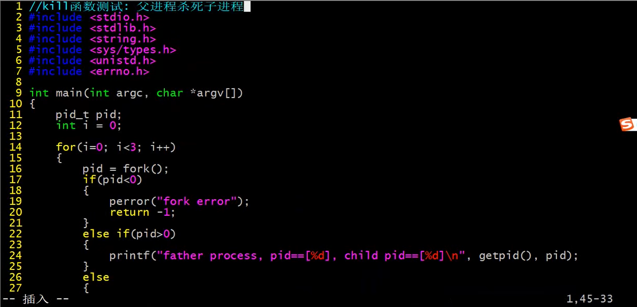 举例:父进程循环创建3个子进程,这三个子进程和父进程是不是同一组?如果说你要想把这四个进程一次性全部给杀死, 函数的pid 参数写0,就可以了,那么这个0是什么意思呢?你要给这个当前进程,他自己,调用这个kill函数进程 是不是叫单独进程啊?给他的一个组发,发哪个信号都可以 发个-9就可以了