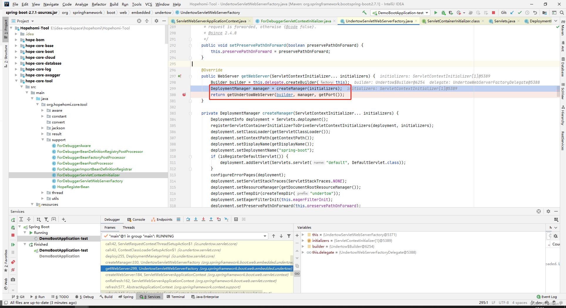 getWebServerFactory方法,通过ioc容器获取ServletWebServerFactory实现实例,在这里我指定的server服务是undertow