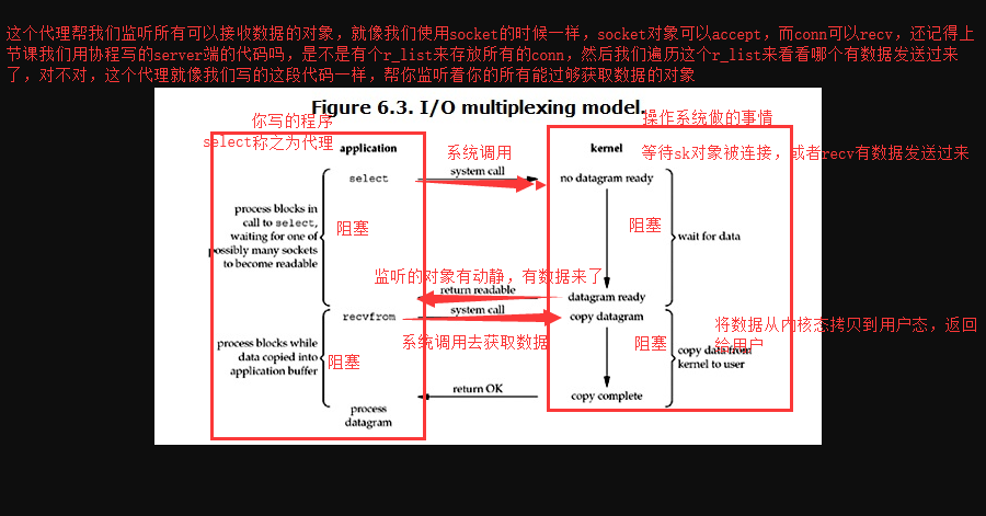 当用户进程调用了select,那么整个进程会被block,而同时,kernel会“监视”所有select负责的socket,当任何一个socket中的数据准备好了,select就会返回。这个时候用户进程再调用read操作,将数据从kernel拷贝到用户进程。
