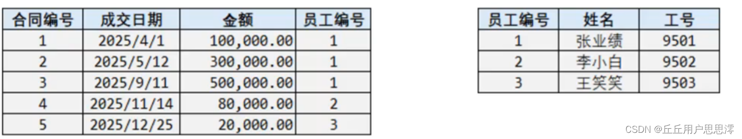 - 这是一个员工和其所签的合同表,关系是一个员工可以签多个合同,是一个一(员工)对多(合同)的表