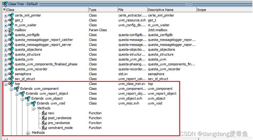 uvm_class_inst定义的top类看似没什么内容,但是仿真、设断点之后发现里面别有洞天,有一层又一层的结构。这是因为top继承了uvm_component,所以也继承了他的结构和内容。
