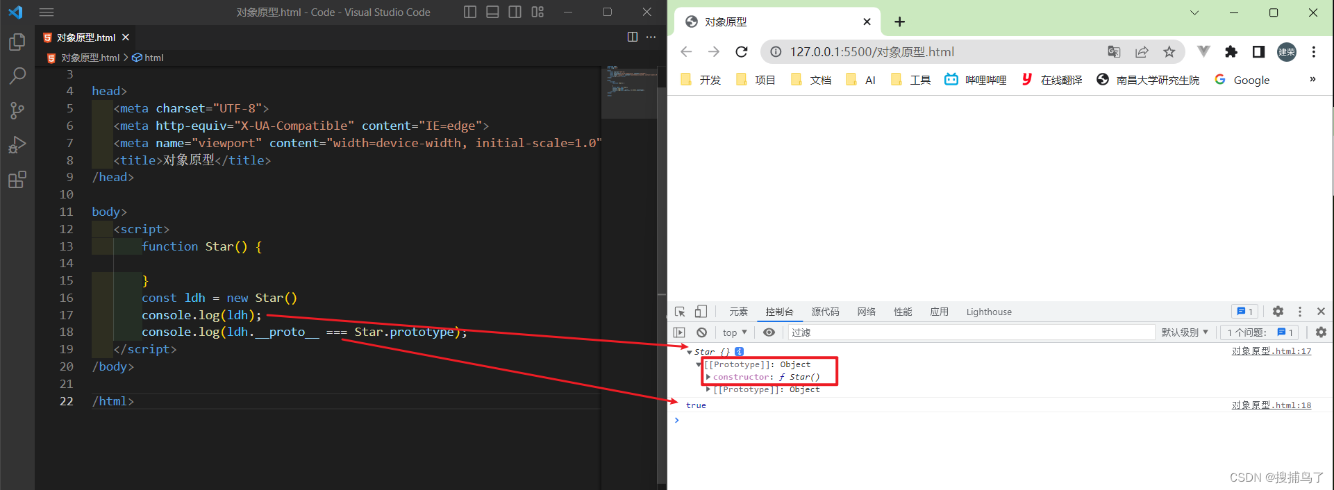 __proto__是JS非标准属性。[[prototype]]和__proto__意义相同。- 用来表明当前实例对象指向哪个原型对象