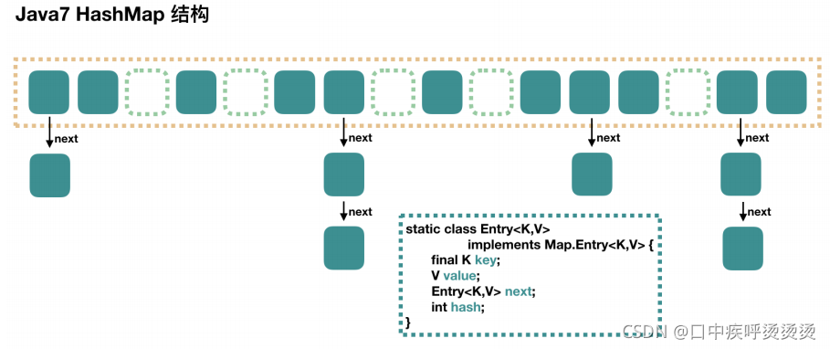 大方向上,HashMap 里面是一个数组,然后数组中每个元素是一个单向链表。上图中,每个绿色的实体是嵌套类 Entry 的实例,Entry 包含四个属性:key, value, hash 值和用于单向链表的next。