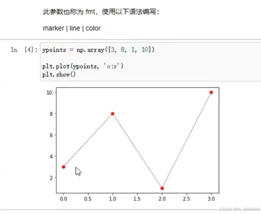 一、pyplot 二、绘图 1.绘制x和y的点 2.无线绘图 3.多点 4.默认x点 三、标记 1.标记 2.参考 3.格式化字符串 4.尺寸 5.颜色 四、线条 1.线形 两个都是设置虚线 2.更短的语法 3.线参考 4.线条颜色 5.线宽度 6.多条线 也可以 五、标签 1.为绘图创建标签 2.为绘图设置标题 3…...