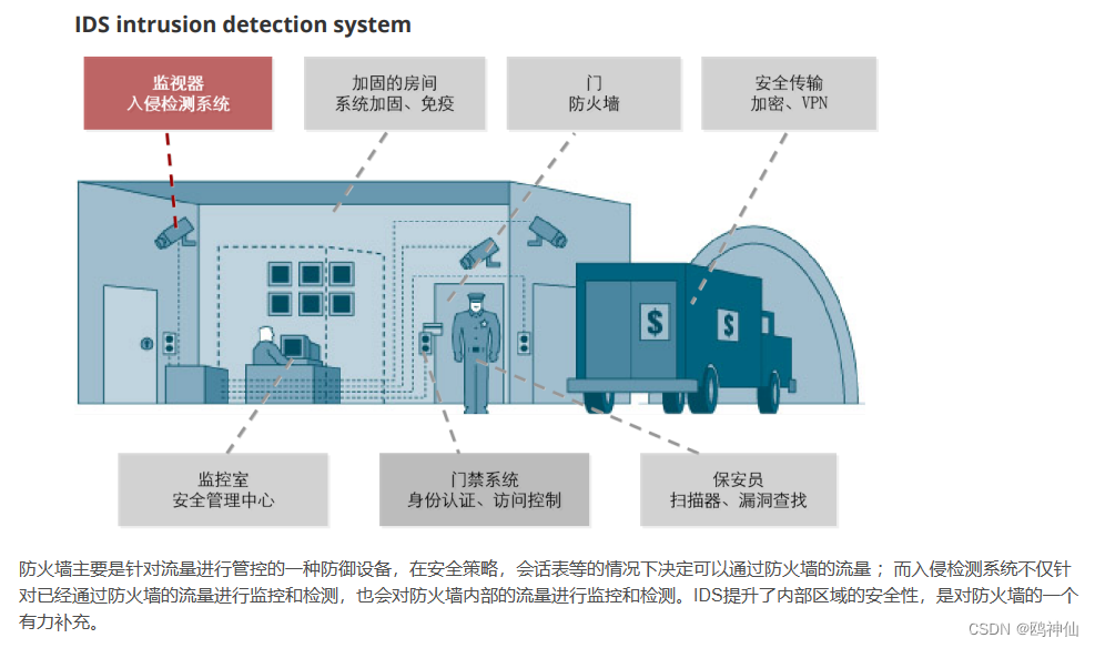 防火墙是针对黑客攻击的一种被动的防御旨在保护,IDS 则是主动出击寻找潜在的攻击者发现入侵行为;