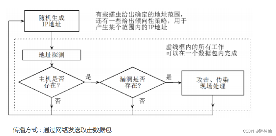 3.1.1病毒 病毒是一种基于硬件和操作系统的程序,具有感染和破坏能力,这与病毒程序的结构有关。病毒攻击的宿主程序是病毒的栖身地,它是病毒传播的目的地,又是下一次感染的出发点。主要传播方式∶感染文件传播3.1.2蠕虫 蠕虫是主要通过网络使恶意代码在不同设备中进行复制、传播和运行的恶意代码。一个能传染自身拷贝到另一台计算机上的程序。
