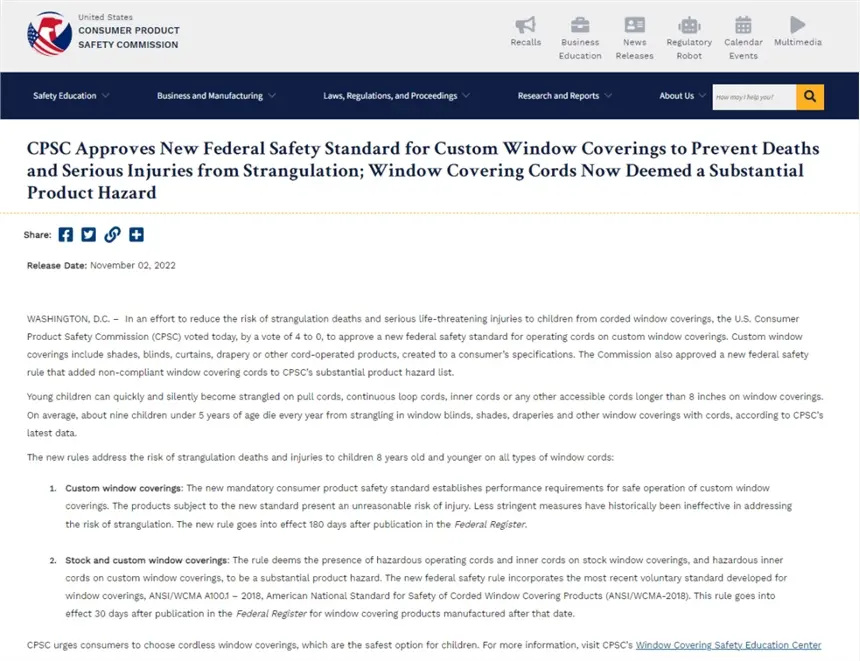 美国消费品安全委员会(CPSC)于2022年11月2日通过了一项新的联邦安全标准。该标准适用于定制窗帘的操作绳,目的是降低带绳窗帘导致儿童窒息死亡和严重危及生命的伤害的风险。委员会还批准了一项新的联邦安全规则,将不合规的窗帘绳添加到CPSC的重大产品危险清单中。公告如下: