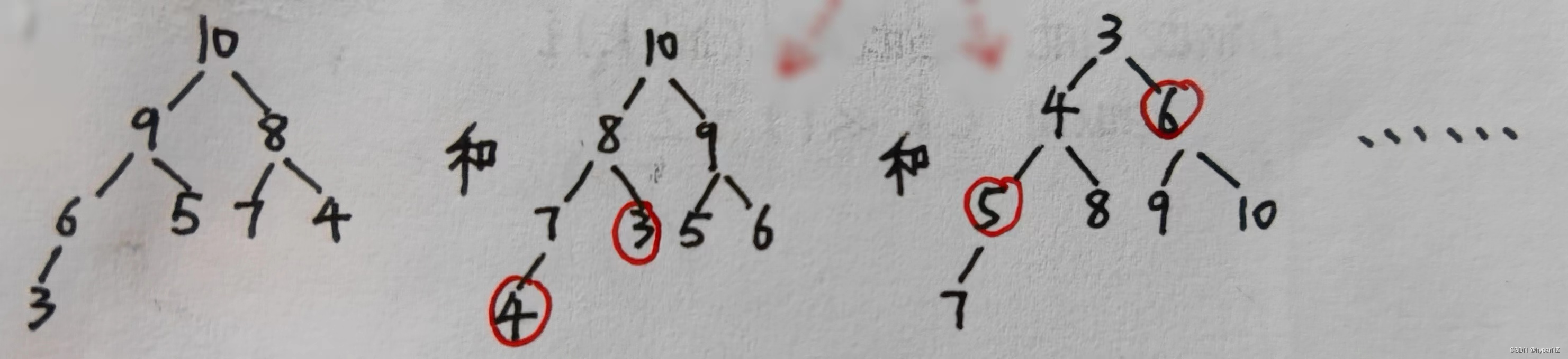 private void siftDown(int i) {//终止条件:当i还有子树时,说明还没判断结束;若左孩子都不存在,则一定不存在右孩子while(leftChild(i) < data.size()) {//此时i索引对应的元素仍然存在左子树,没到叶子节点int j = leftChild(i);//此时还存在右子树if(j + 1 < data.size() && data.get(j + 1 ) > data.get(j)) {//此时右子树的值大于左子树j = j + 1;}//j一定保存了左右子树的最大值索引if(data.get(i) >= data.get(j)) { //此处为何是 >=//如果此处终止条件是 父节点 > 子节点,也可以,不会死循环//以后在写测试用例时,必须要复杂//此时i对应的元素已经下沉到合适位置break;}else{swap(i,j);i = j;}}