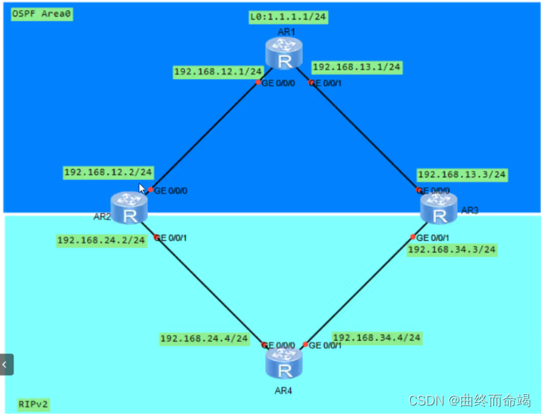 实验要求: 1、R1环回使用重发布,R2和R3使用双向重发布 2、使用路由策略解决,选路不佳 第一步,基础配置 [R1]int l0 [R1-LoopBack0]ip add 1.1.1.1 24 [R1-LoopBack0]int g0/0/0 [R1-GigabitEthernet0/0/0]ip add 192.168.12.1 …...