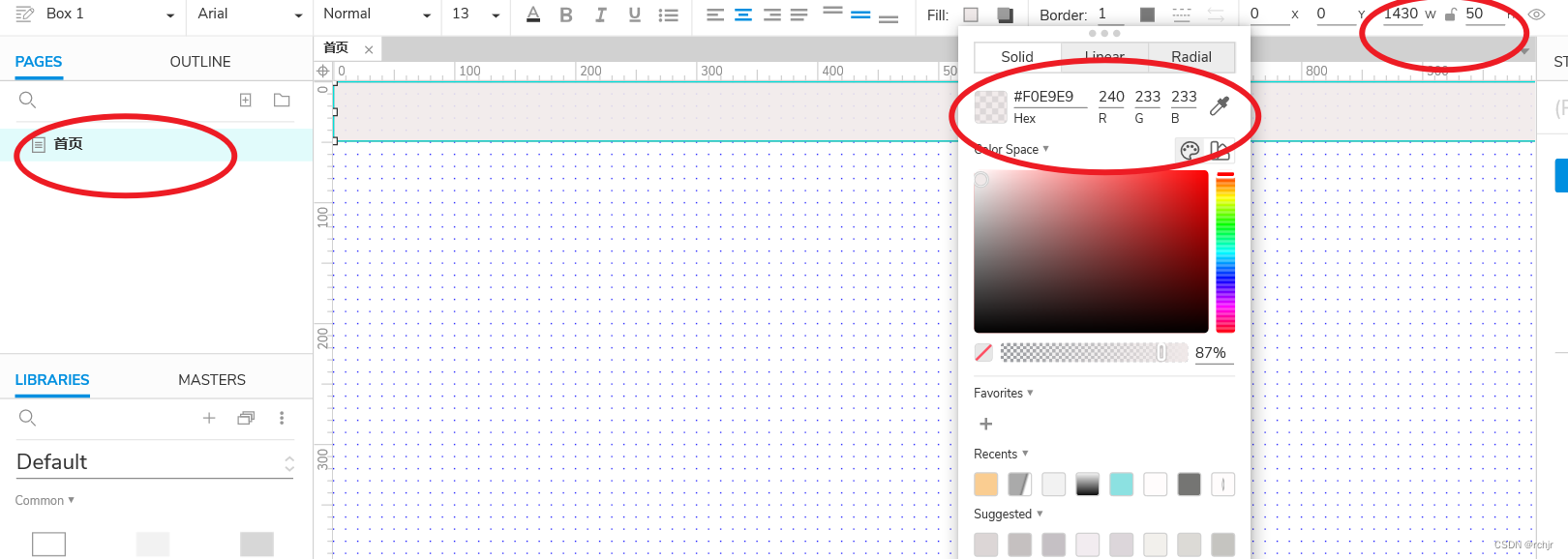 然后创建一个页面改名为首页,并拖入一个box开始顶部导航栏的设计。按照如下设定修改其样式