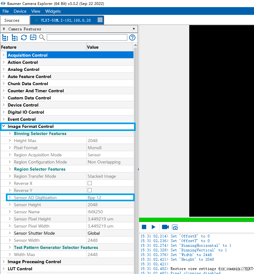 3、查看Camera Features界面参数,可以看到当前相机的像素格式为Bpp12格式