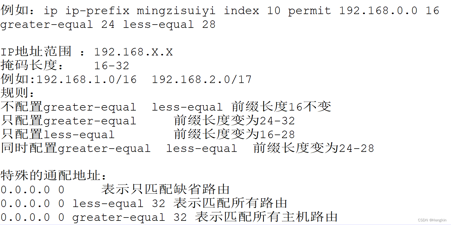 [heng]ip ip-prefix mingzisuiyi index 10 permit 192.168.0.0 16 greater-equal 24 **注释:匹配最小为24的,也就是24-32前缀长度的**